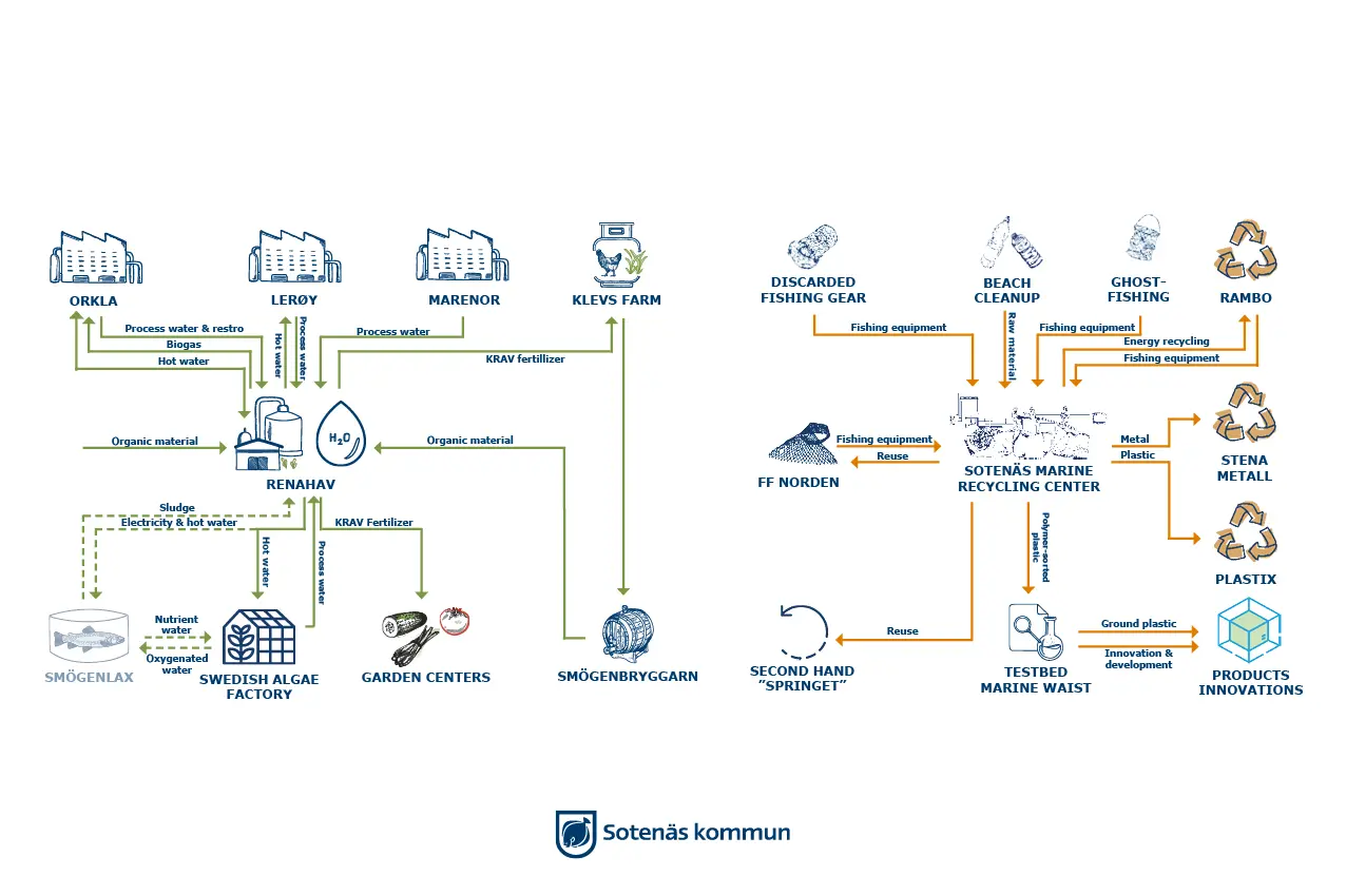 In order to support industrial and social symbiosis between actors, Sotenäs Center of Symbiosis facilitate and coordinate the symbiosis development. In a symbiosis network, the companies or other entities exchange competence, products, energy, services and other benefits in order to create added value and improve industrial productivity. Benefits created in the symbiosis network retained jobs and companies, reduced eutrophication and CO2-emissions as well as increased revenue and lower costs for transportation and waste handling.